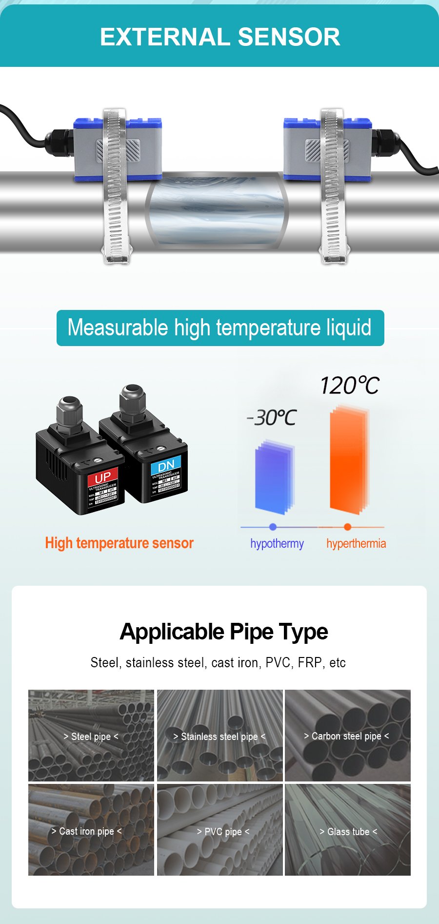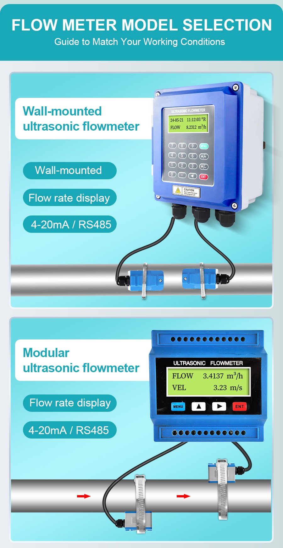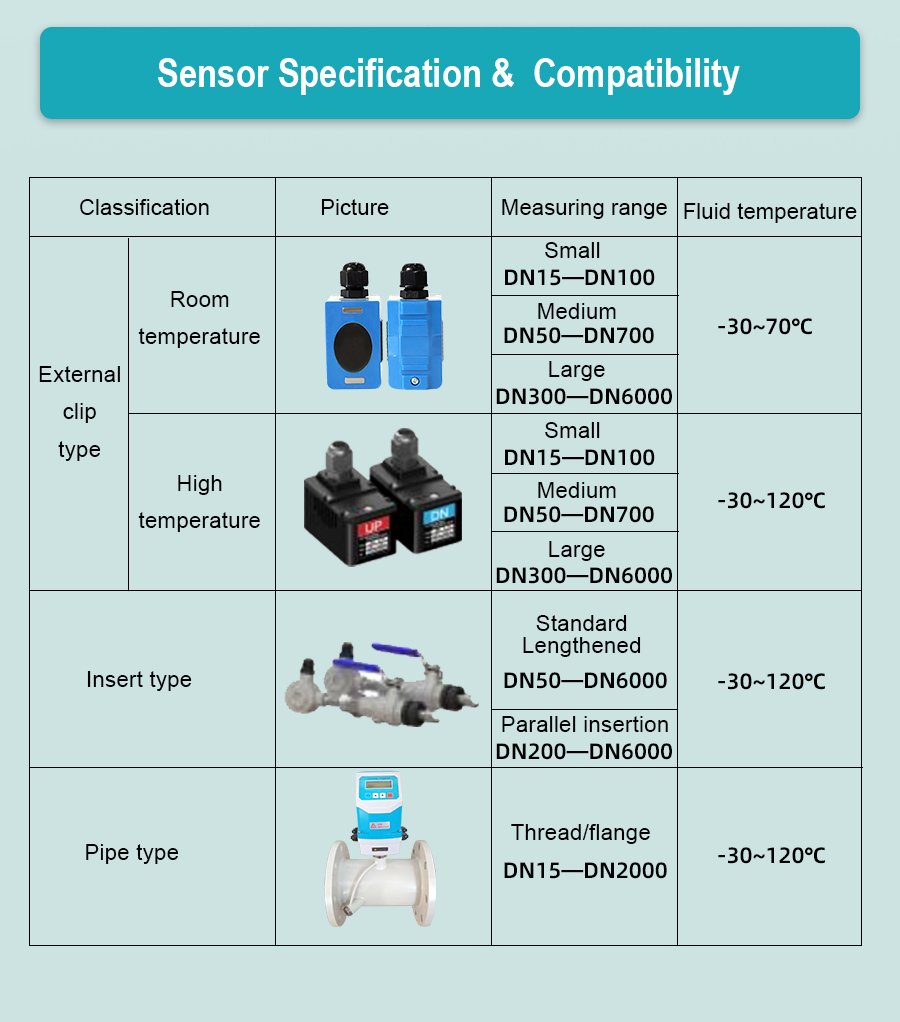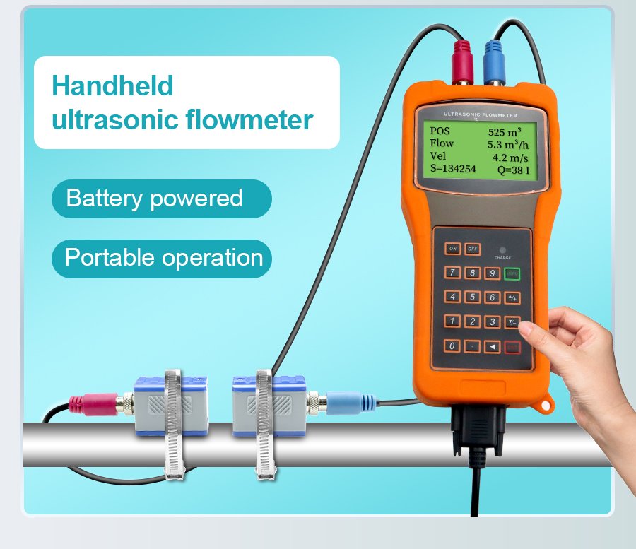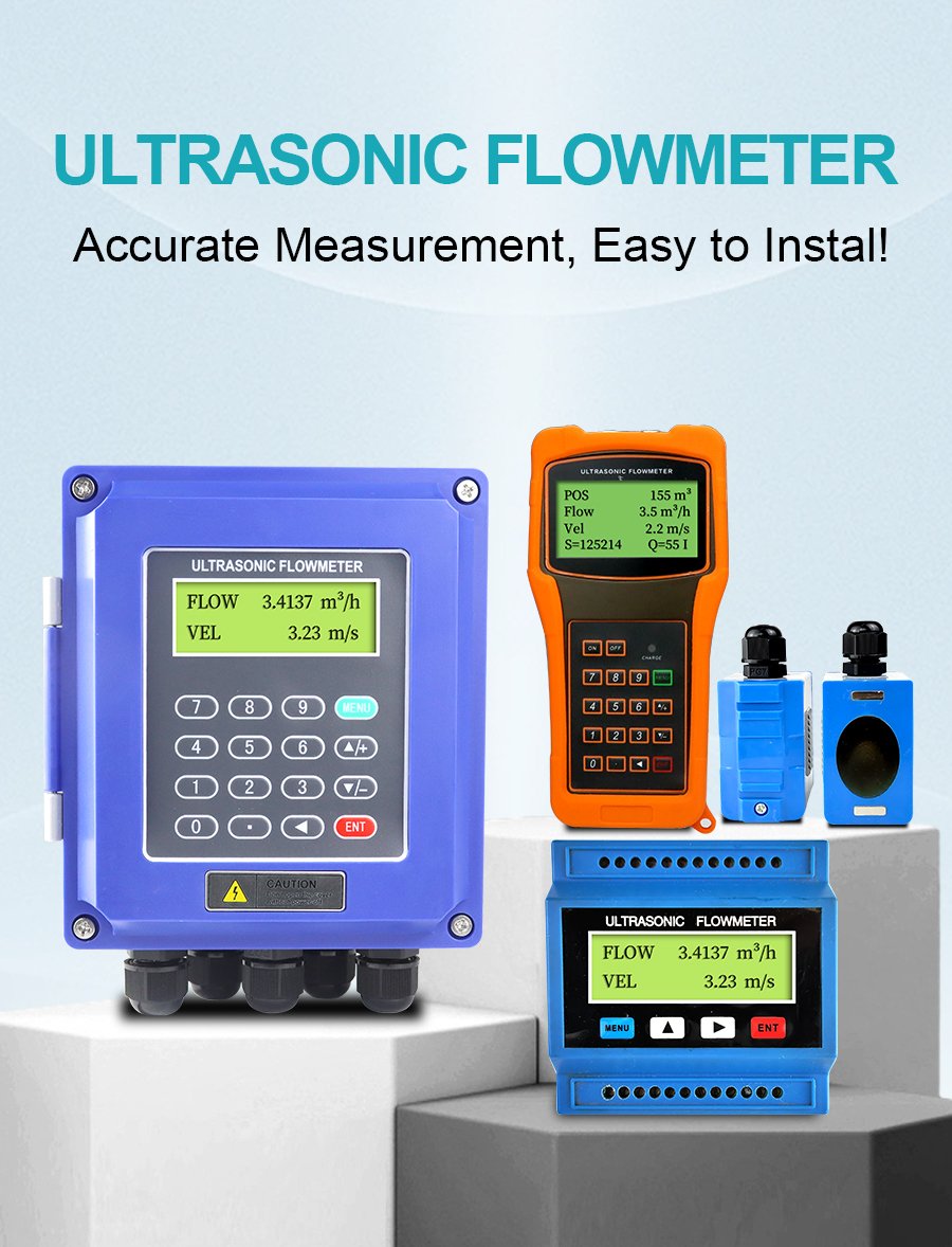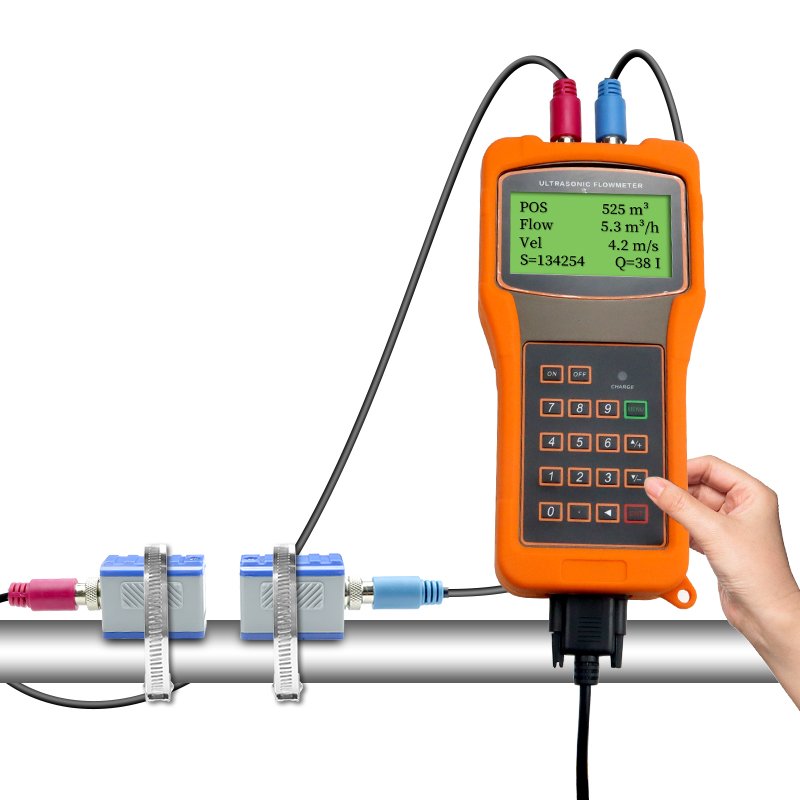 Ultrasonic Flow Meter – Designed for pipes DN15 and larger, measuring flow velocity from 0.3 to 6 m/s. Features non-invasive installation (no pipe cutting, no shutdown required) with external clamp-on sensors. Compatible with water, seawater, oil, alcohol and other homogeneous liquids. Works on steel, stainless steel, cast iron, PVC, and FRP pipes with uniform density.
