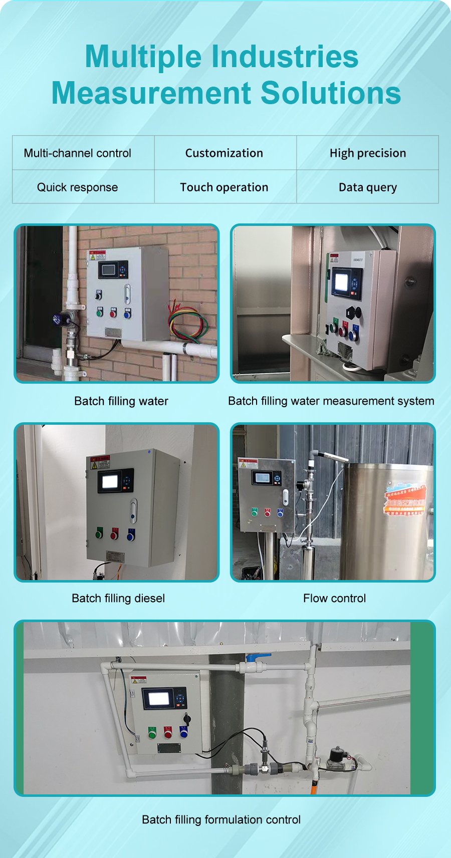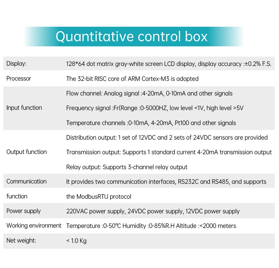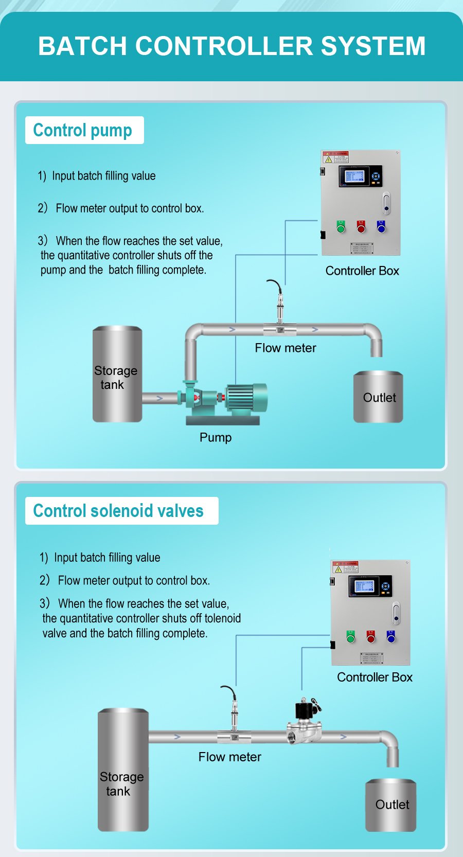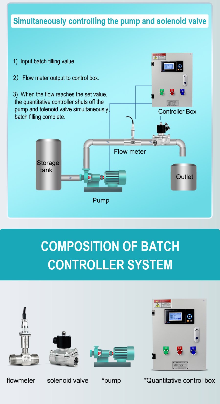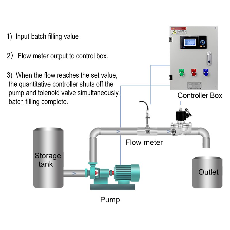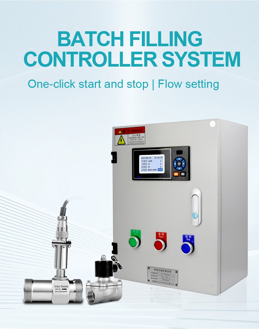The batch filling controller system is composed of a quantitative control box, a flow meter, an electromagnetic valve and a pump. It has three quantitative methods: controlling the pump, controlling the valve and simultaneously controlling the pump and the electromagnetic valve. It is suitable for quantitative water addition, quantitative material issuance and quantitative filling sites. The button-operated quantitative control box features simple operation with one-touch start and reset, supports RS485 and 4-20mA signal input, cumulative report query, and can be customized as an explosion-proof model.