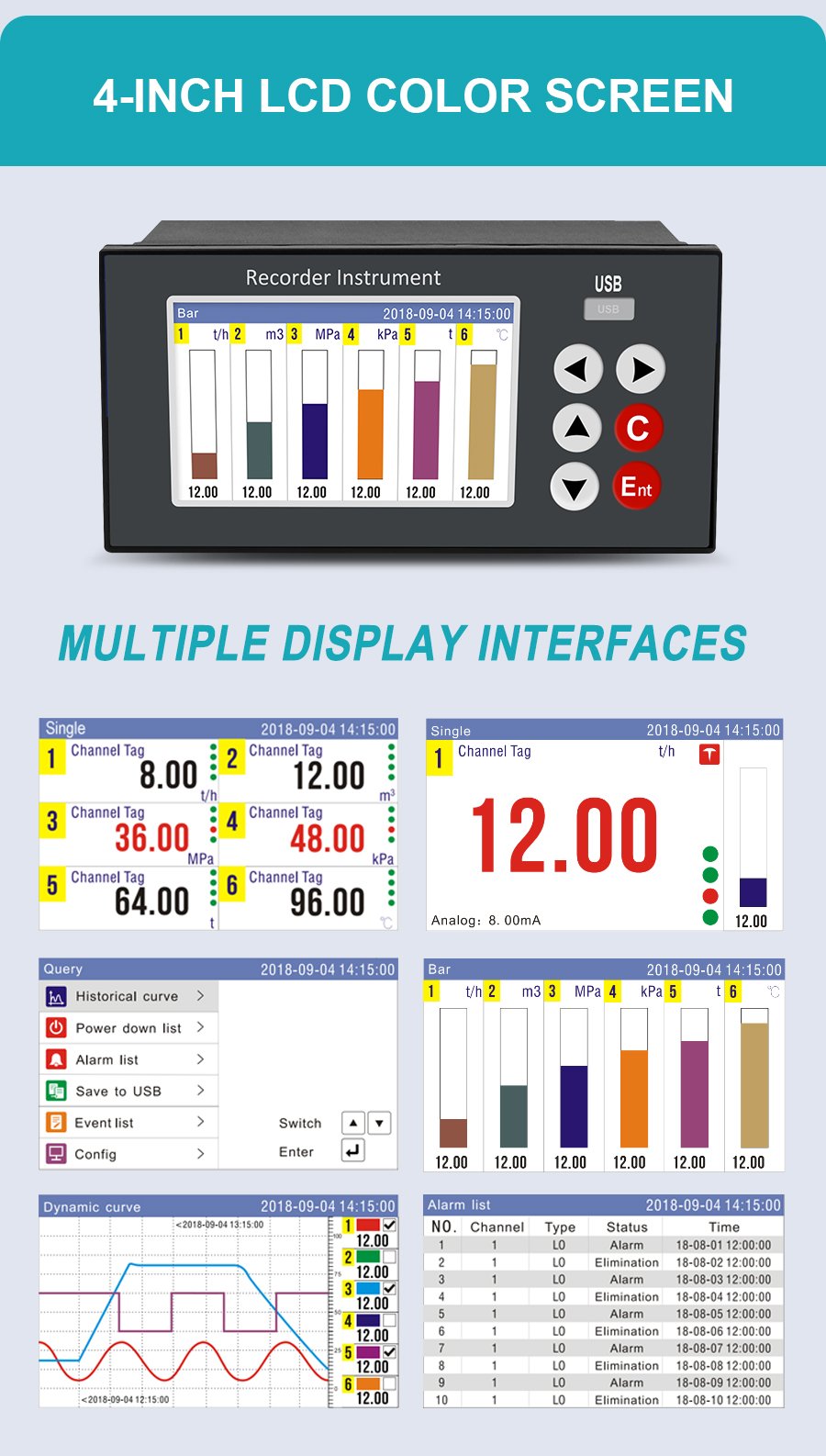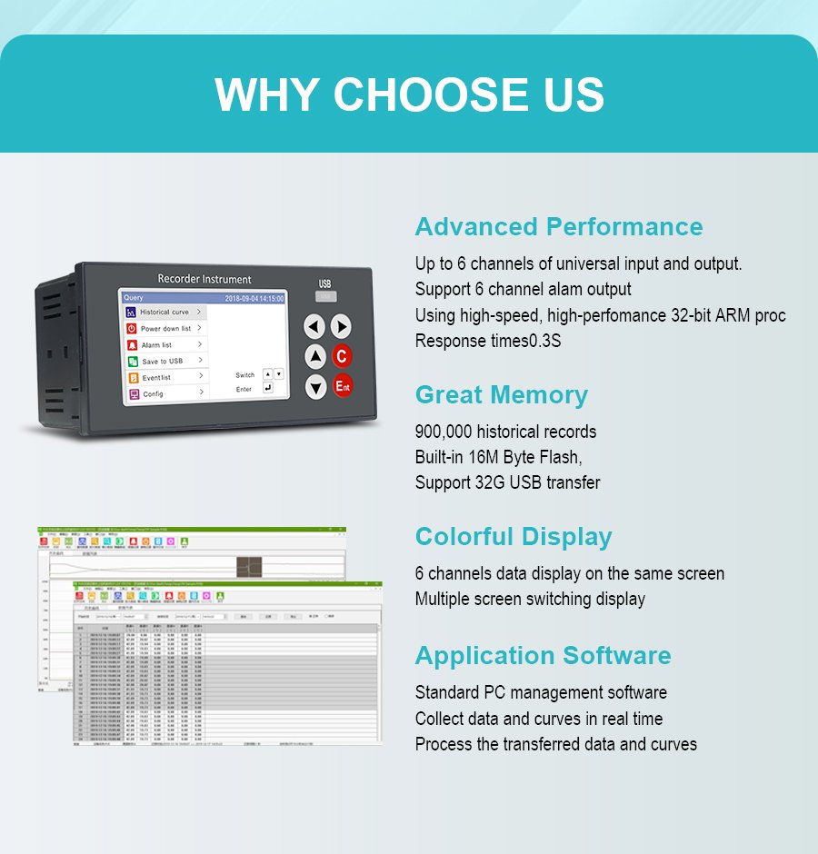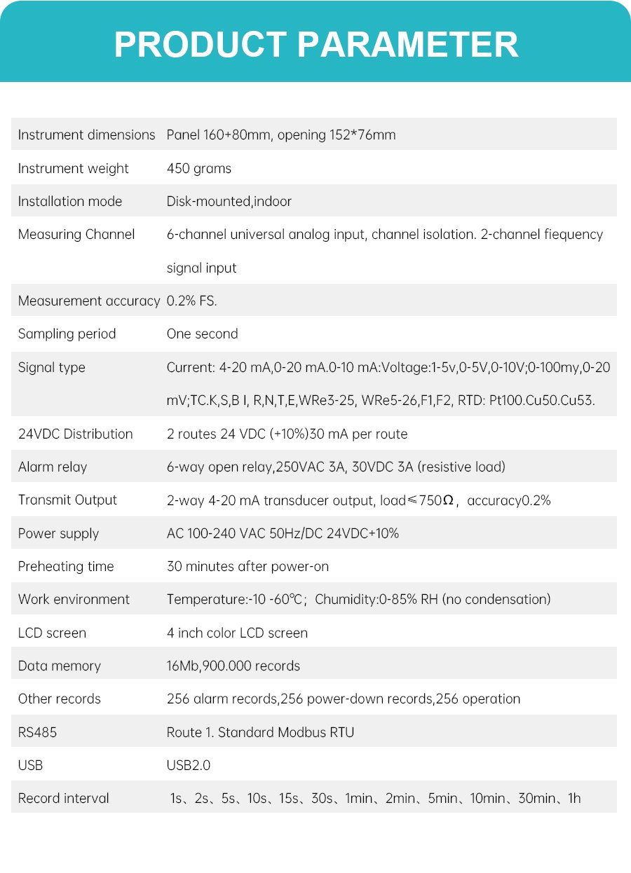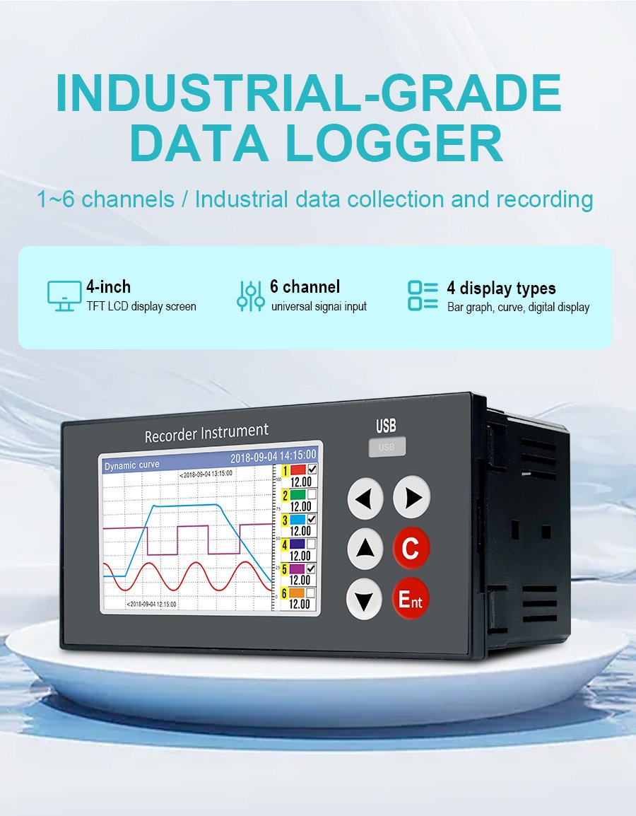 GT68R Data Logger – 4-inch button color screen, real-time curve/historical curve one-click switching, multiple interfaces intuitive display. It is applicable to various working conditions such as pipeline pressure monitoring and data alarm monitoring, and is compatible with various sensors including pressure, flow and liquid level sensors. A 1-second sampling period, 0.2% high-precision measurement, 1-6 analog signal inputs, 1-6 relay outputs, and equipped with a USB2.0 high-speed data backup interface. Provide reliable process control and quality traceability solutions for enterprises